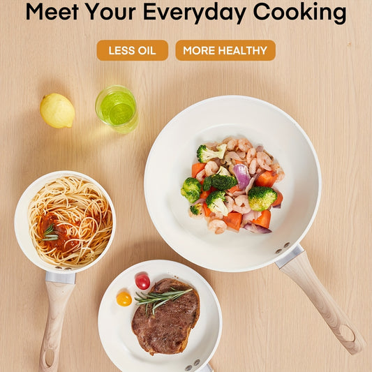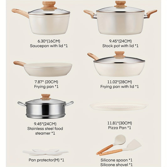 15pcs Ceramic Pots and Pans Set, Non-stick Cookware Sets, Kitchen Induction Cooking Set with Pizza Pan, Food Steamer, Saucepans, Frying Pans (White)