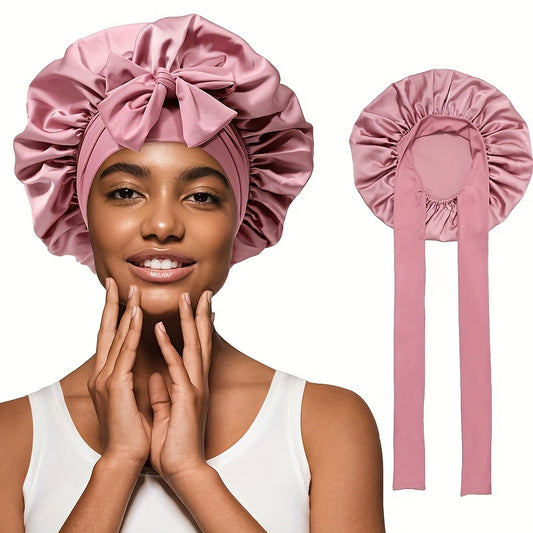 Luxurious Pink Satin Sleep Cap for Women - Adjustable, Silk-Like Night Hat with Bowknot, Ideal for Curly Hair, Nylon-Polyamide Blend, Fragrance-Free - Perfect Gift for Ladies