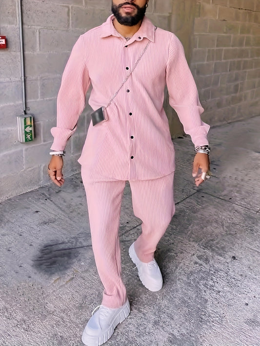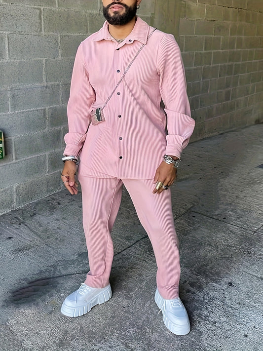 Men's 2Pcs Outfits, Casual Lapel Button Up Long Sleeve Shirt And Pants Set For Summer, Men's Clothing For Daily Leisure Vacation Resorts, Coquette Style