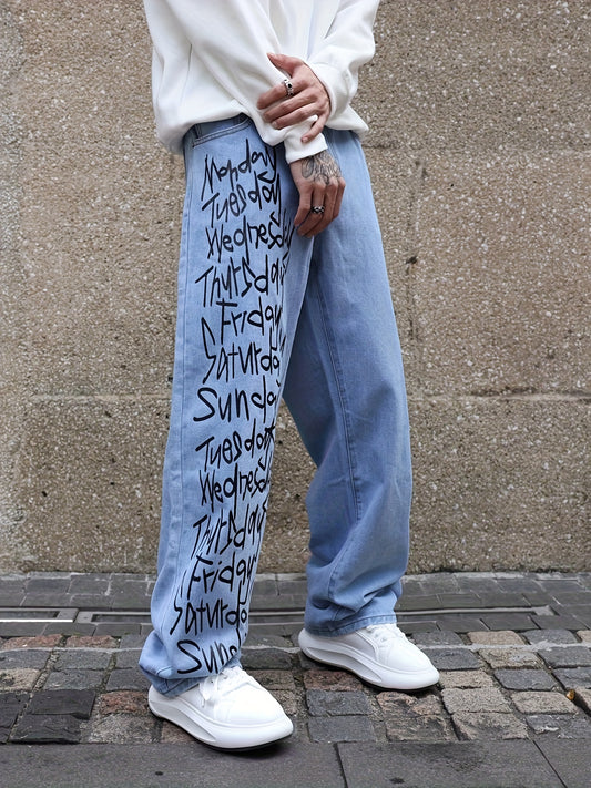 Men's Casual Letter Print Wide-Leg Jeans - Loose Fit, Rayon Blend Denim Pants for All Seasons