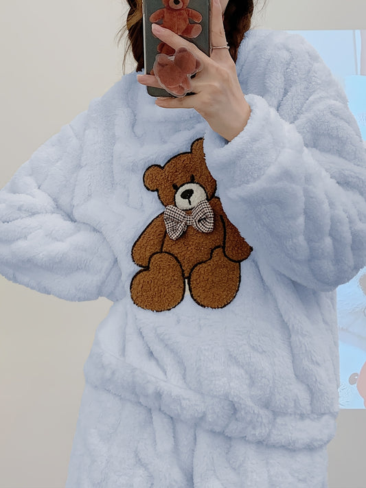 New Autumn and Winter Thick Warm Pajama Set with Jacquard Velvet Long-Sleeve Bear Top and Flannel Pants for Winter
