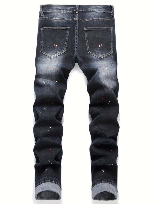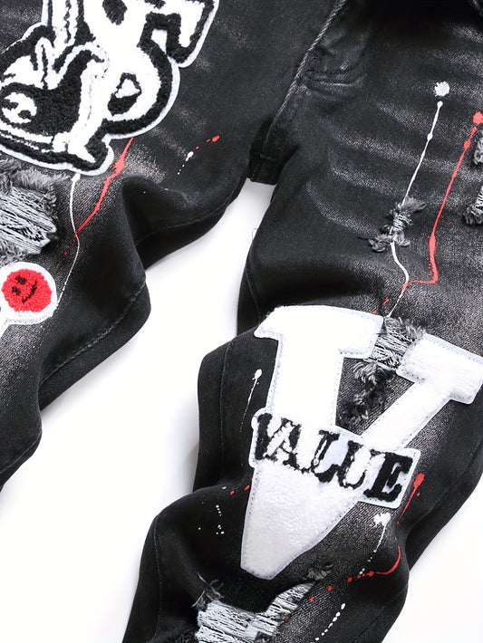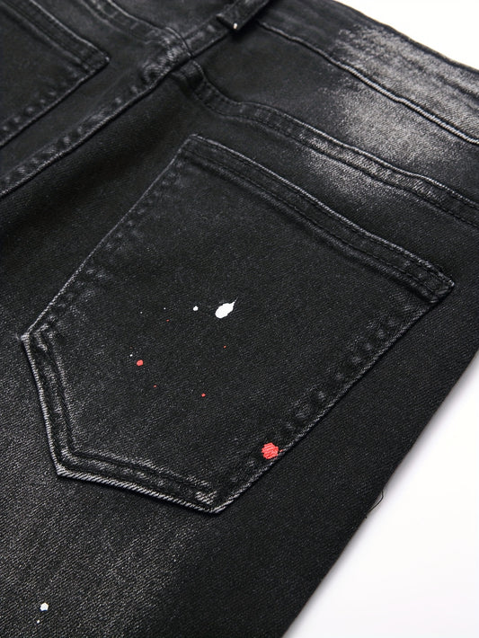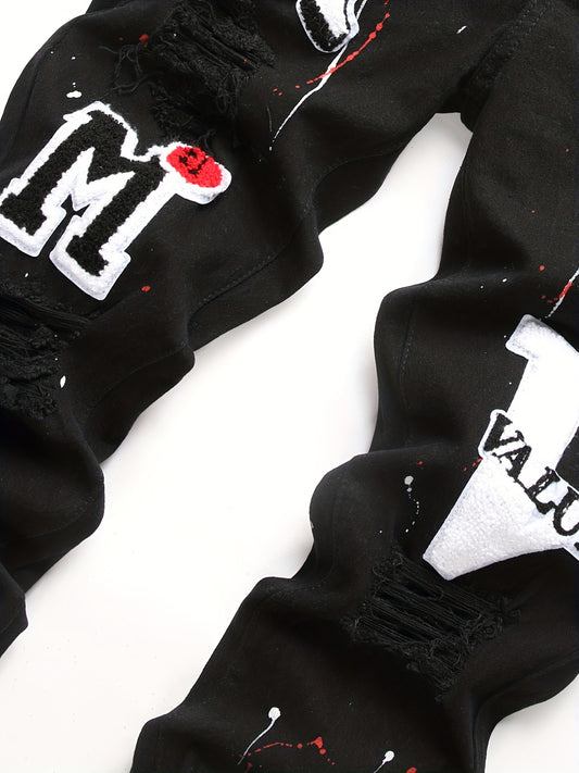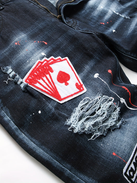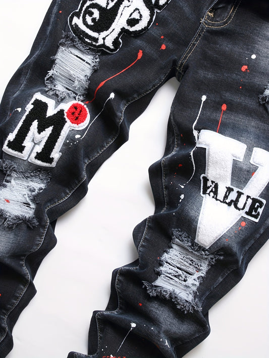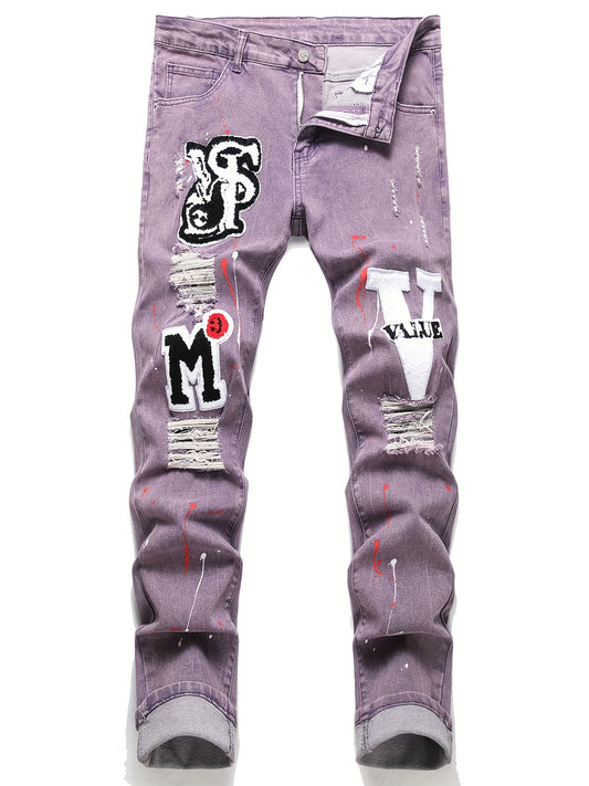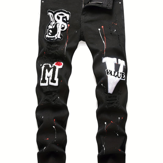 Patch Splatter Ripped Jeans, Men's Casual Street Style Distressed Slim Fit High Stretch Denim Pants For Spring Summer