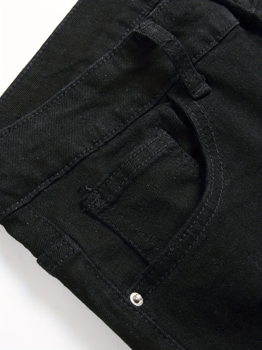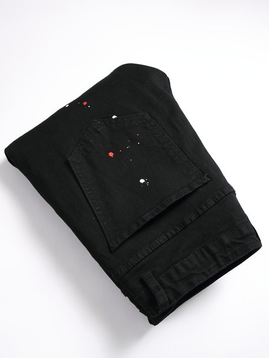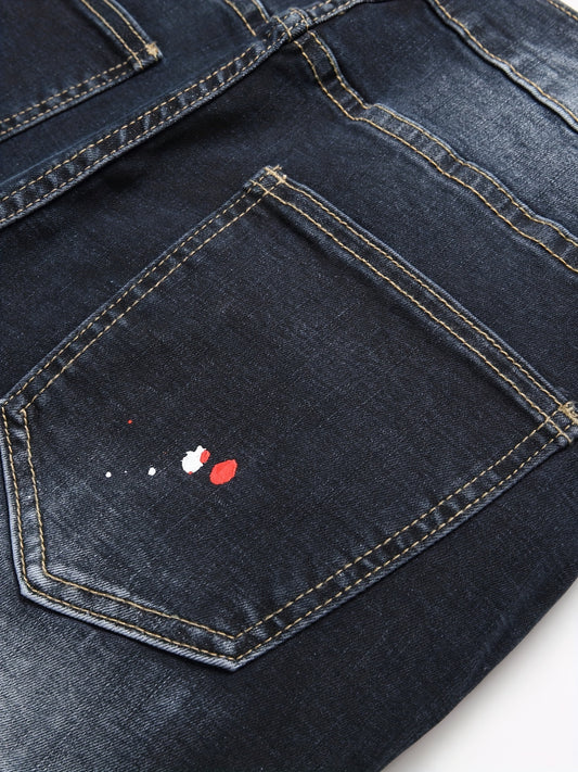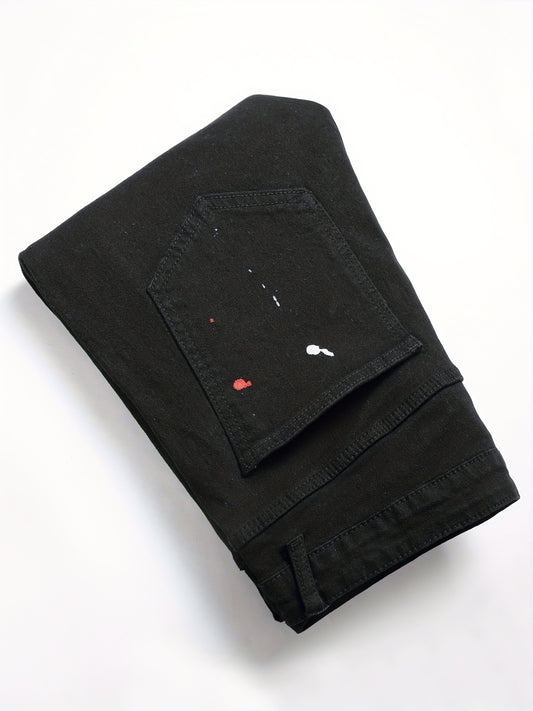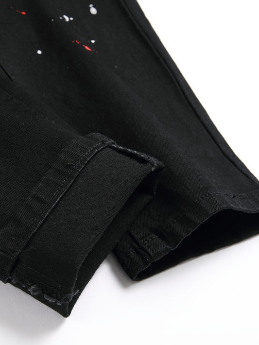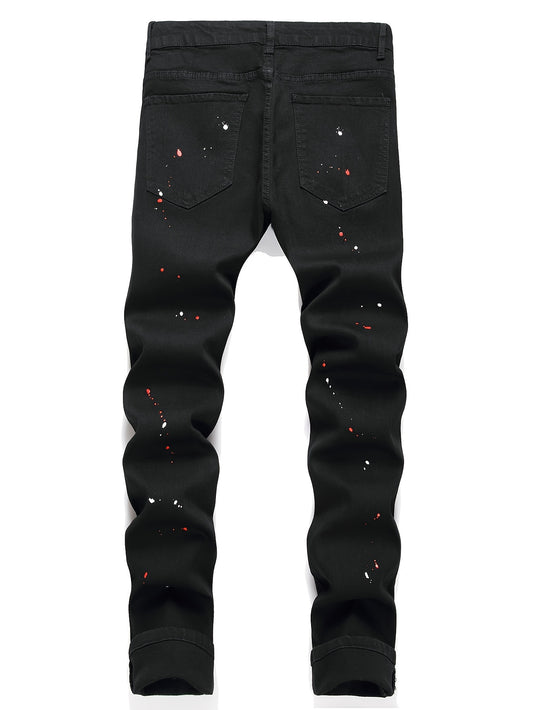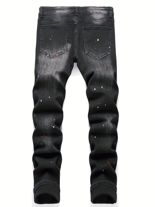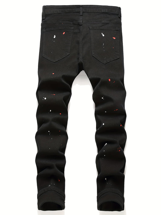 Patch Splatter Ripped Jeans, Men's Casual Street Style Distressed Slim Fit High Stretch Denim Pants For Spring Summer