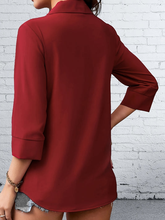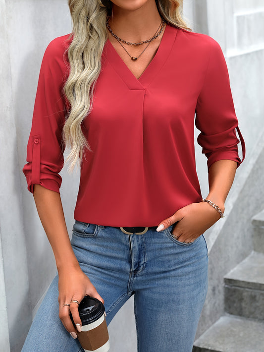 Solid V Neck Blouse, Elegant 3/4 Sleeve Blouse For Spring & Fall, Women's Clothing