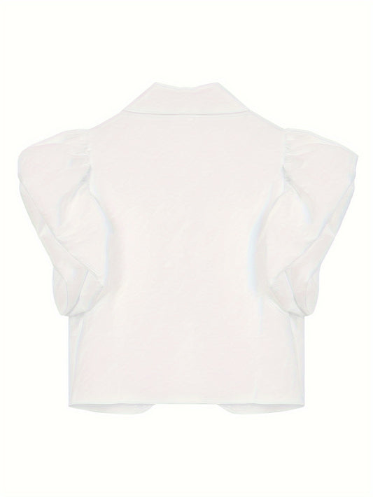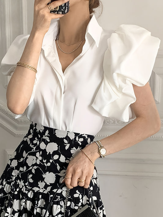 Solid Puff Sleeve Blouse, Elegant Lapel Collar Short Sleeve Blouse, Women's Clothing