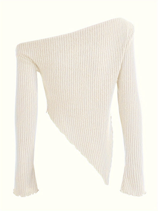 Solid Ruched Asymmetrical Neck T-Shirt, Casual Hanky Hem Long Sleeve Top For Spring & Fall, Women's Clothing