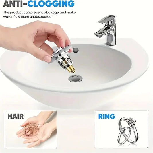 Universal Rebound Drain Plug Filter Basin Pop-up Chrome Sink Filter with Hair Catcher Bathroom Sink Drain Stopper Easy Push Type