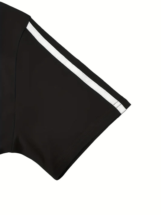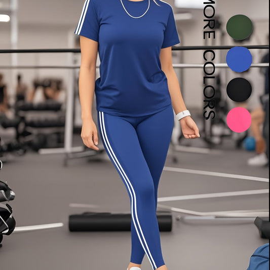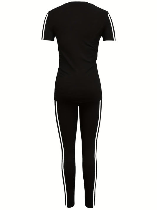Women'S Casual Fashion Outdoor Sports Set, Double-Sided Striped Round Neck Short Sleeve Long Pants Two-Piece, Women'S Jogging Suit, Solid Color, Medium Stretch, Regular Sleeve, Crew Neck, Side Stripe, Pullover, Spring/Summer/