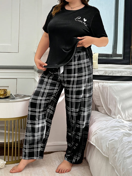 Women's Plus Size 2pcs Pajama Set - Oversized Round Neck Short-Sleeve Nightgown & Plaid Pants with Heart Print, Soft Polyester Blend All-Season Sleepwear, Machine Washable Cozy Lounge Set in Black/White (Casual Elegant Pajama