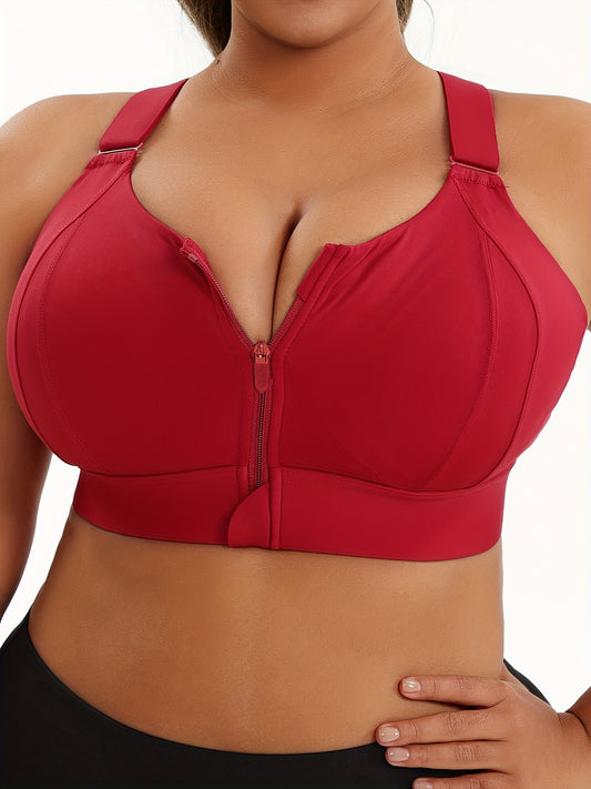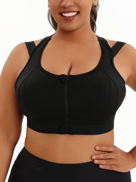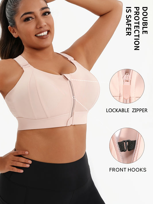 Women's Plus Size Sports Bra, Front Zip Closure, High Support Fitness Active Wear, Breathable Comfortable Lingerie, For Basketball Yoga Sports, Simple Look