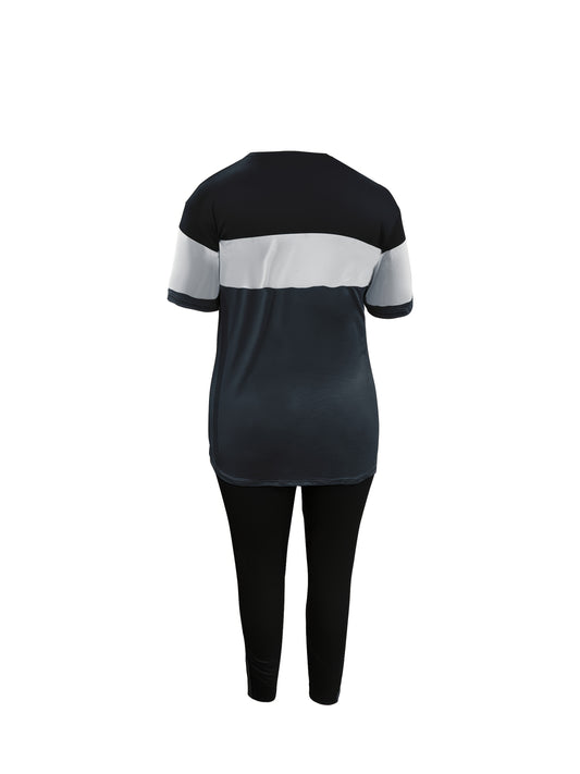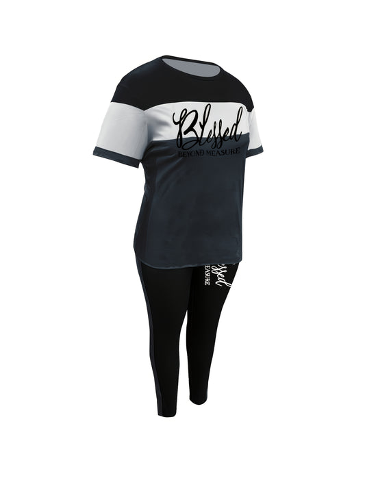 Women's Plus Size Two-Piece Set - Casual Color Block "Blessed" Graphic Tee & Pants with Pockets, Stretchy Polyester Blend, Machine Washable, Daily Comfort Outfit|Color Block Design|Elastane Comfort Stretch