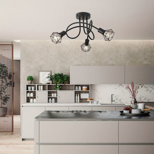 1pc Industrial 3 Way Ceiling Light, Hanging Light, Semi Flush Mount E14 Base, Black Metal Cage 3 Lights, Bedroom, Living Room, Dining Room, Hallway, Ceiling Light Fixture (Bulb Not Included)