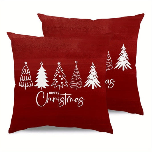 2pcs Red Christmas Tree Pillow Covers with White Cursive Merry Christmas Lettering & Tree Silhouettes - Burgundy Cases for Sofa, Bed, Office - Zippered Holiday Decorations (No Insert) - Hand Wash Only Festive Home Accent