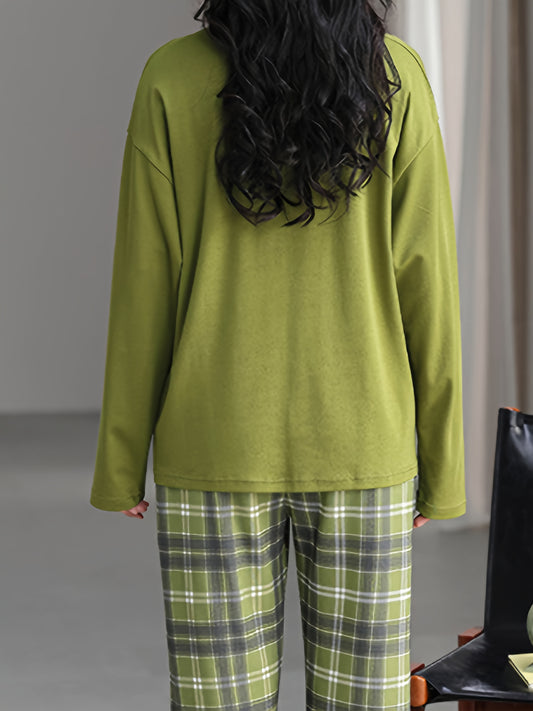 2pcs Women's pajama set, green round neck long-sleeve top with plaid print and elastic waist pants, comfortable casual fit, machine washable, essential home wear for autumn and winter