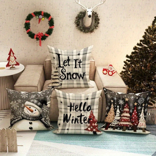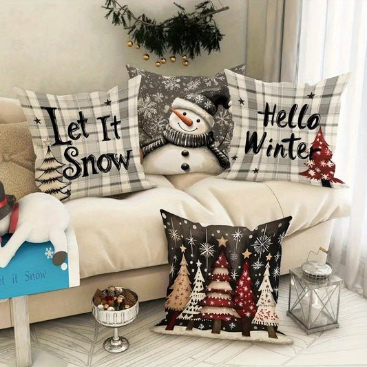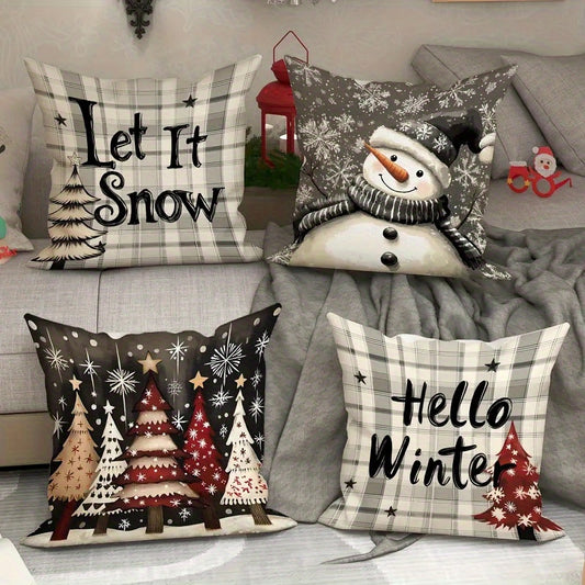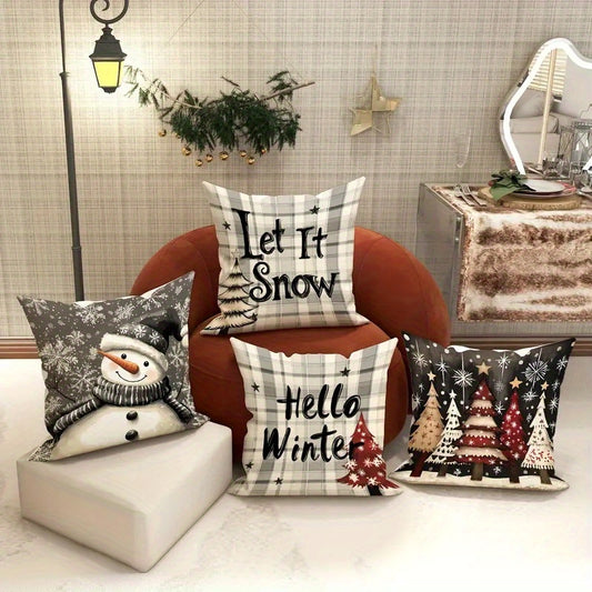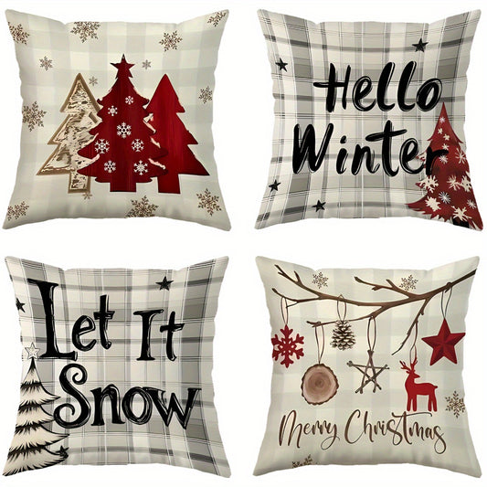 4pcs Christmas Themed Pillow Covers with Winter Elements like Christmas Trees, Snowflakes, and Reindeer - Festive Holiday Decorative Cushion Covers for Home, Car, Bed, Sofa, Office - Zipper Closure, Machine Washable, Polyeste