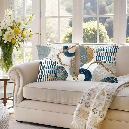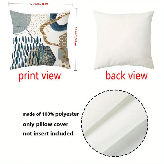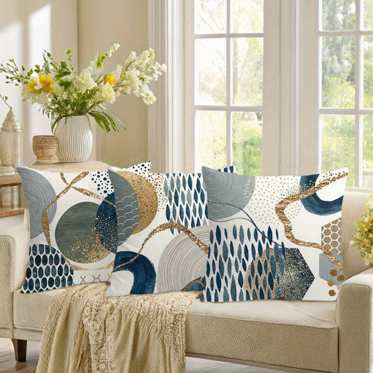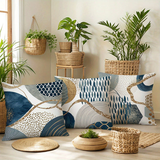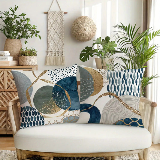 4pcs Bohemian Style Short Plush Blue Abstract Geometric Pattern Throw Pillows with Zipper, Navy Blue and Golden Watercolor Shapes, Farmhouse Decorative Cushions, 14x14, 16x16, 18x18, 50.8x50.8 cm, Machine Washable Polyester,