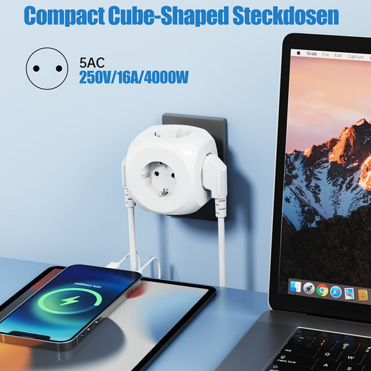 5-in-1 Portable Power Socket Adapter - 4000W Large Capacity, Compact Cube Design with 4 USB Ports & 2 AC Outlets, European Plug, On/Off Switch for Home & Office Appliances, White, Power Adapter for Electronics, Versatile Char