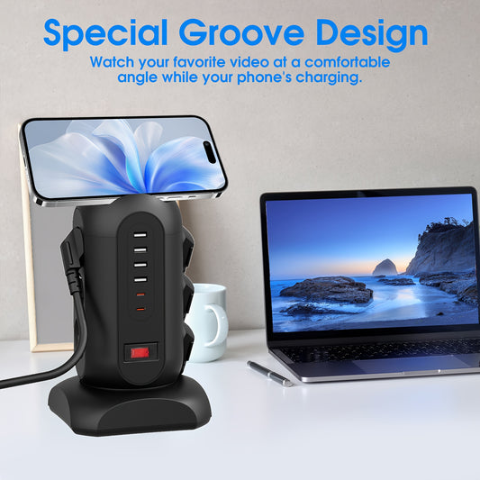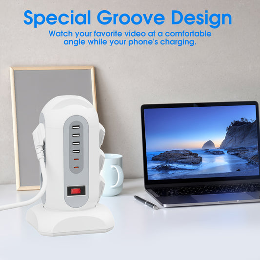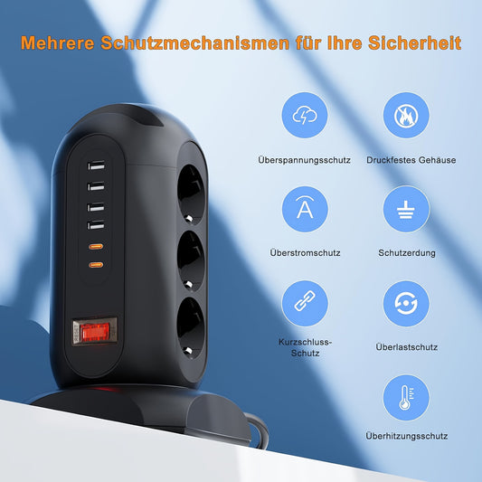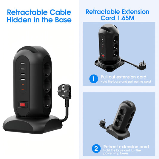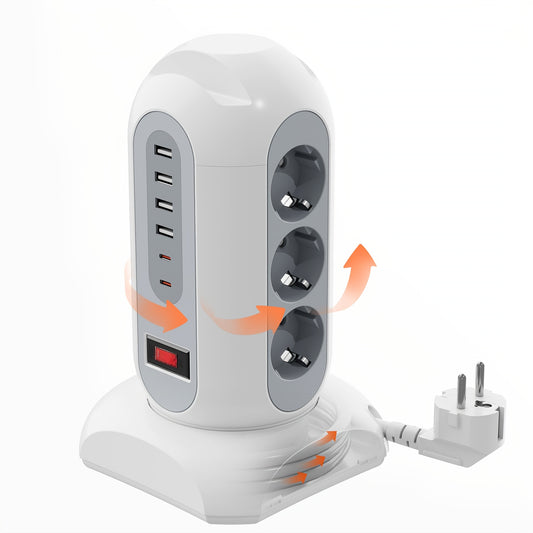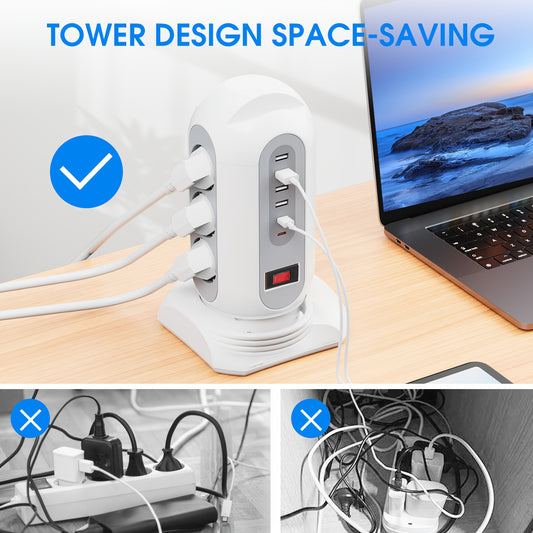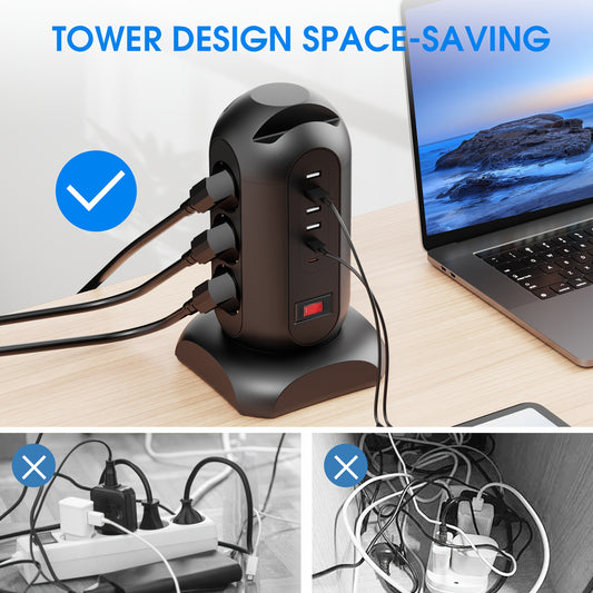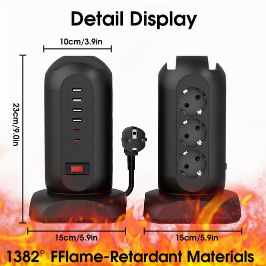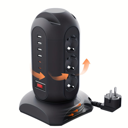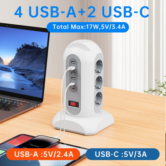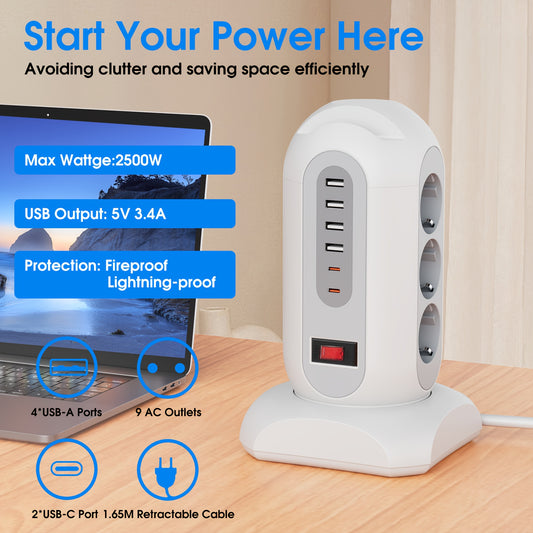 9 European Standard Power Outlets, 4 USB + 2 Type-C, Tower Surge Protector with Overload Protection Switch, 1.65m Cord – Ideal for Home, School, Office & Workshop Use