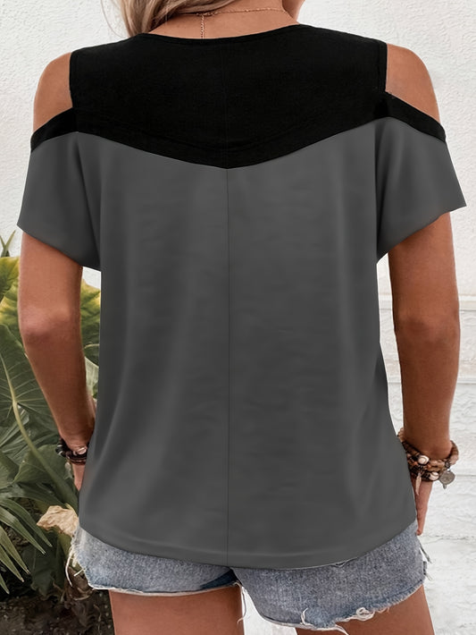 9068# Women's Plus Size Off-Shoulder Round Neck T-Shirt - Color Block Striped Summer Top, Breathable Machine-Washable Casual Elegant Tee, Ladies T Shirts, Easycare Clothing, Nontransparent Fabric, Relaxed Fit, Stylish Blouse,