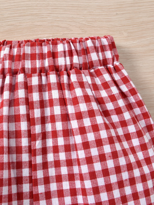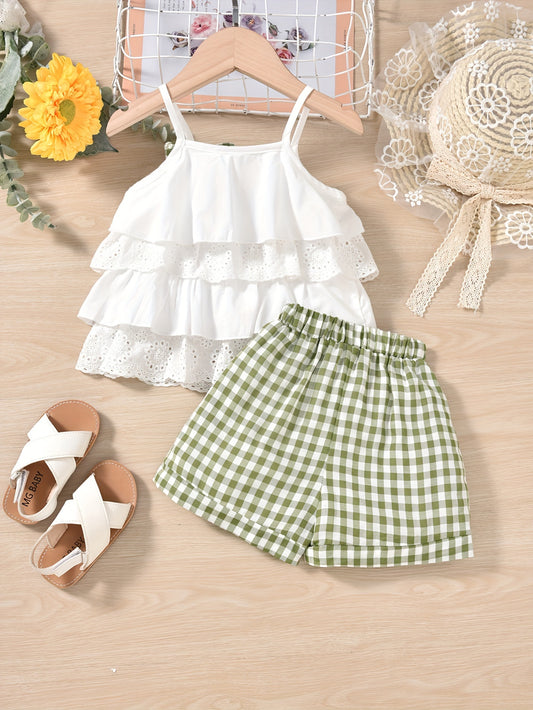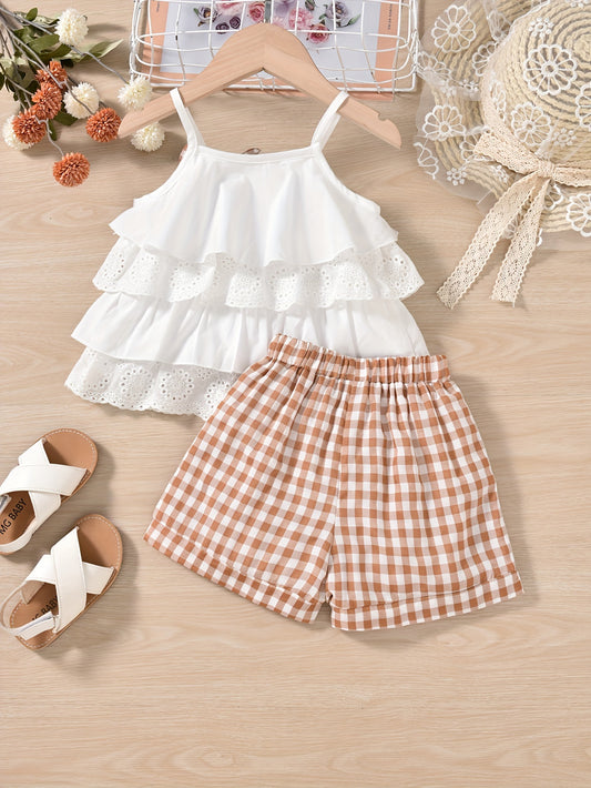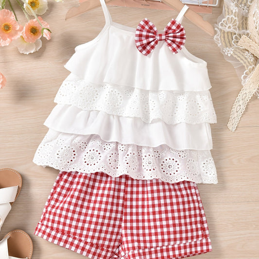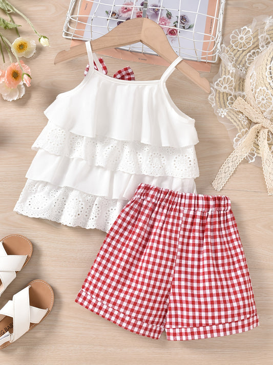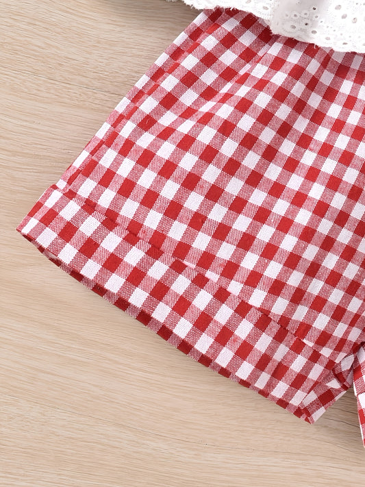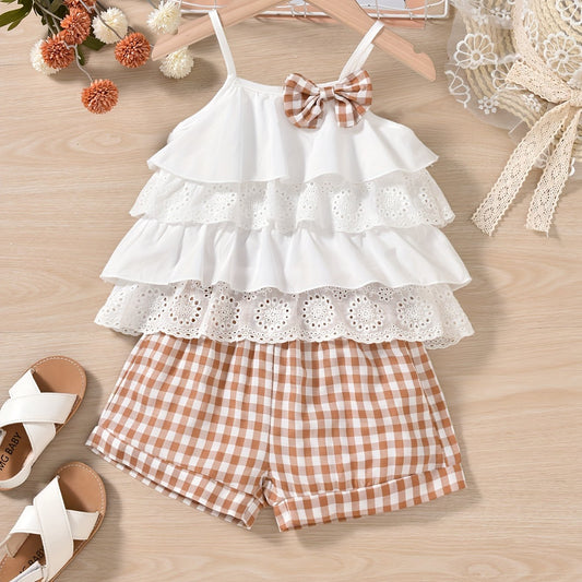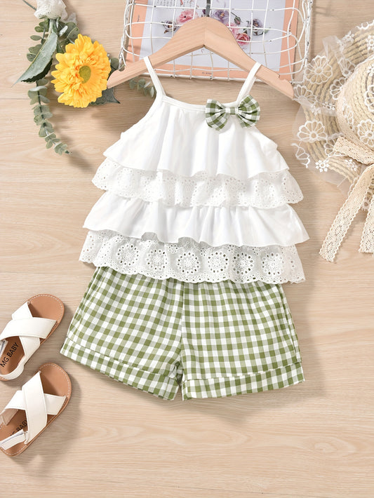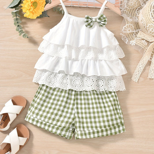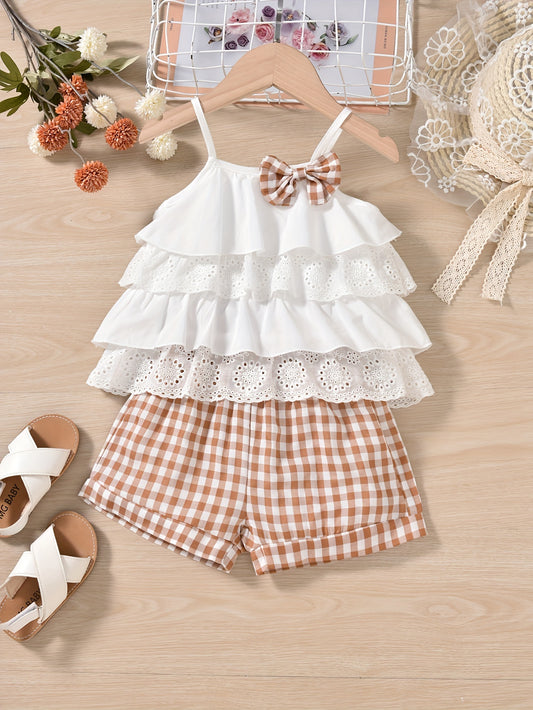 Cute Ruffle Lace Top & Check Shorts Two-Piece Set - White Blouse with Yellow Bow, Yellow & White Gingham Shorts, Perfect for Spring/Summer, Casual Playwear|Ruffle Detail Top|Nonstretch Fabric, for Outdoor