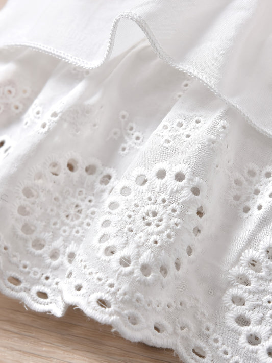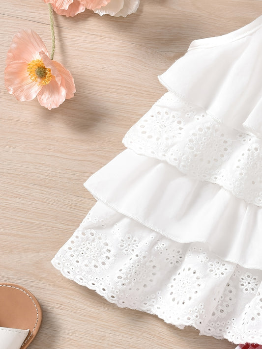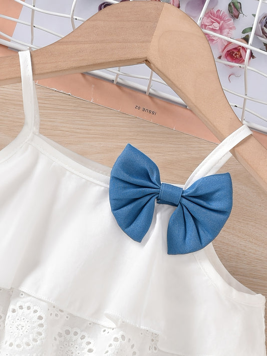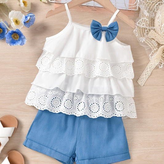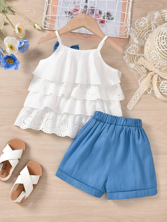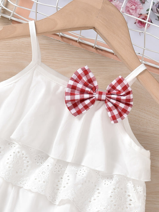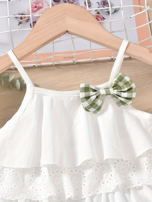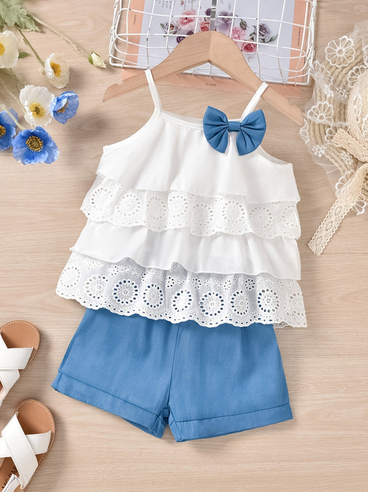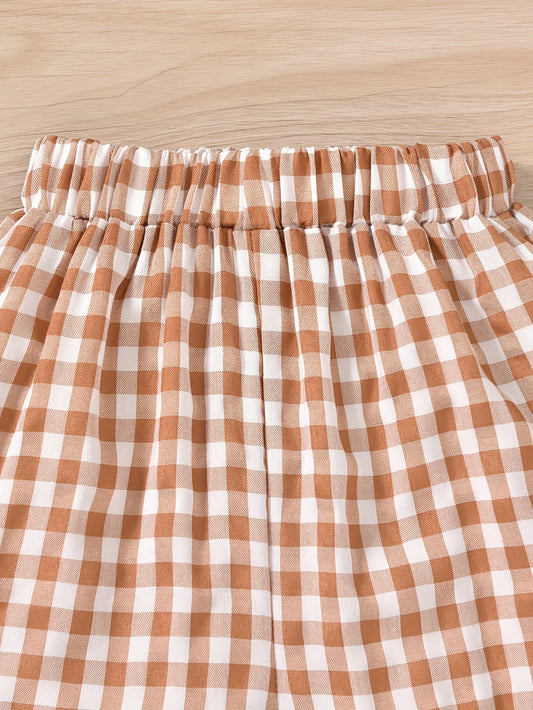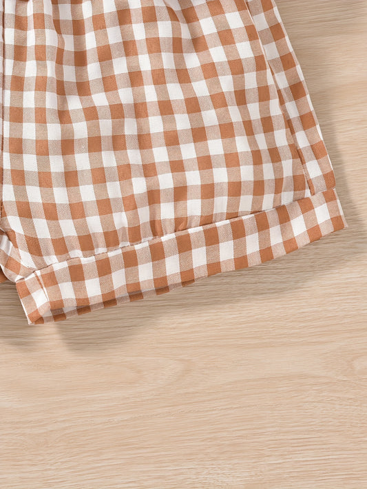 Cute Ruffle Lace Top & Check Shorts Two-Piece Set - White Blouse with Yellow Bow, Yellow & White Gingham Shorts, Perfect for Spring/Summer, Casual Playwear|Ruffle Detail Top|Nonstretch Fabric, for Outdoor