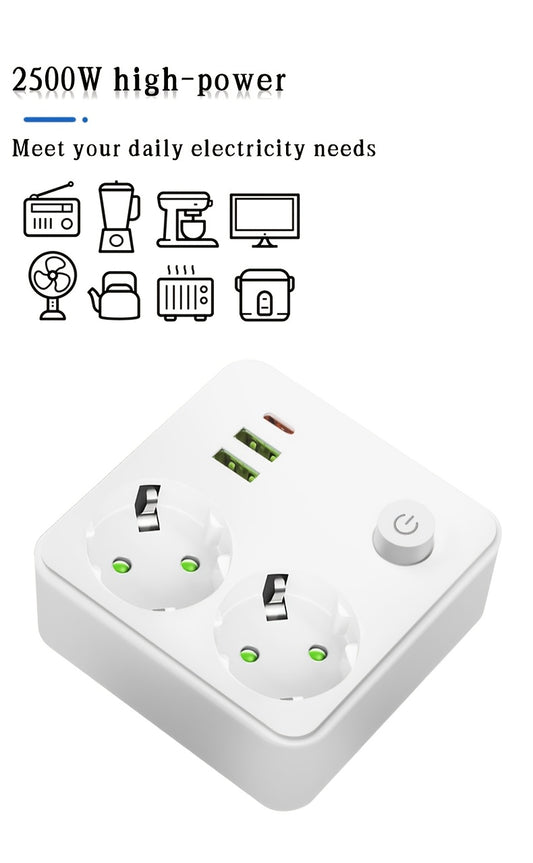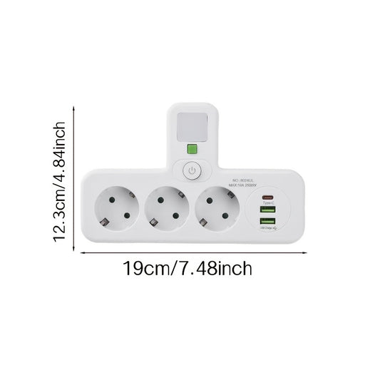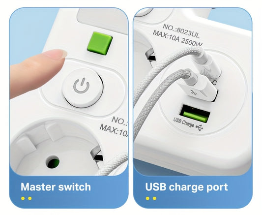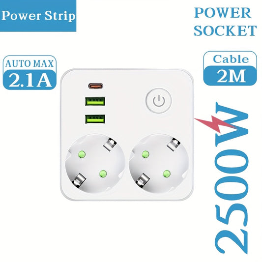 European Standard Heavy-Duty 2500W Power Strip with 2 USB-A & 1 Type-C Ports, Global Voltage 110-250V, Overload & Overheat Protection, White EU Plug Converter for Home Office, Bedroom, Kitchen, Industrial Use - Multi-Function