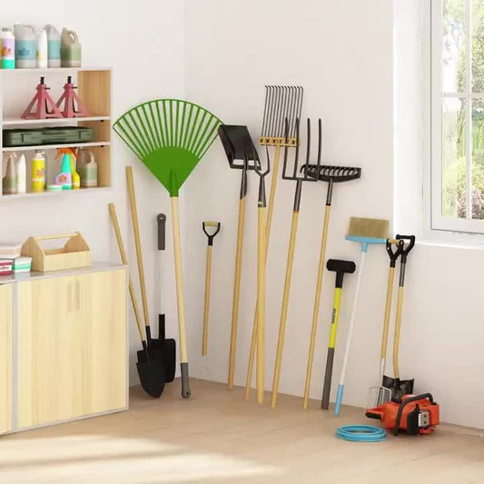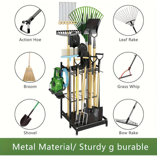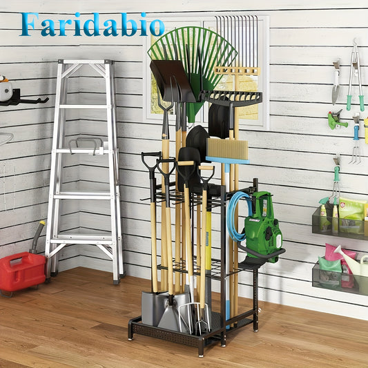 Faridabio Heavy-Duty Metal Garden Tool Organizer with Hooks - Multi-Tiered Utility Storage Rack for Long-Handled Tools, Broom, Shovel, Rake - Sturdy Outdoor Patio Storage Rack, Black (Assembly Required)