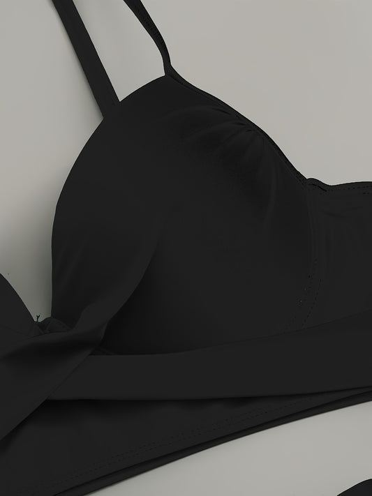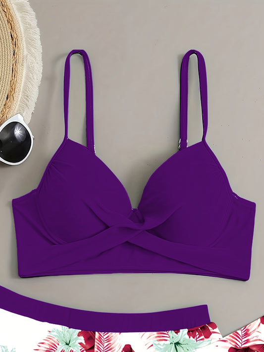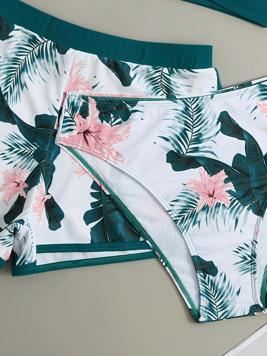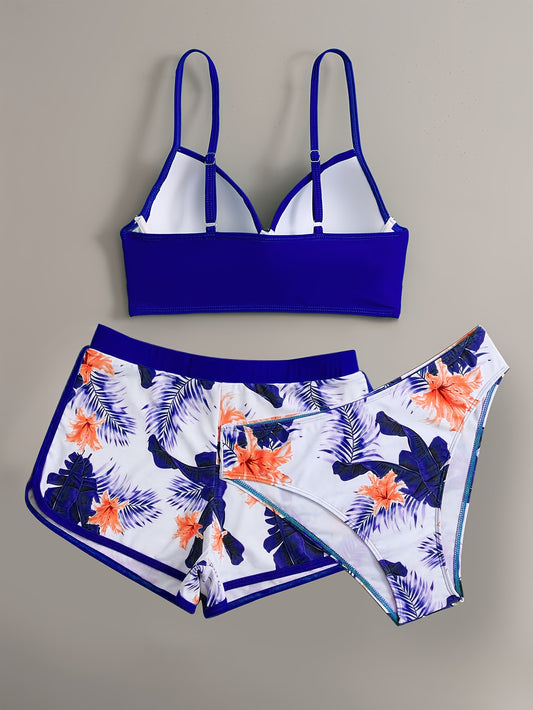 Floral Leaf Print Stretchy 3 Piece Set Swimsuits, Cross Spaghetti Strap Push Up Bikini & Boxer Shorts, Women's Swimwear & Clothing