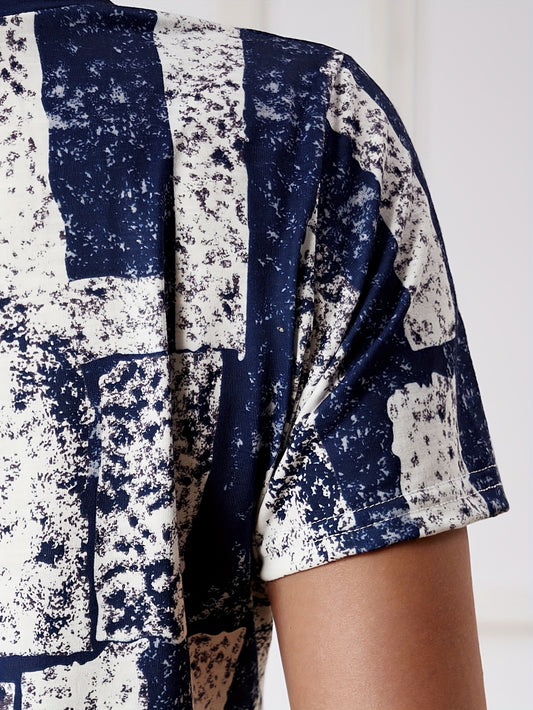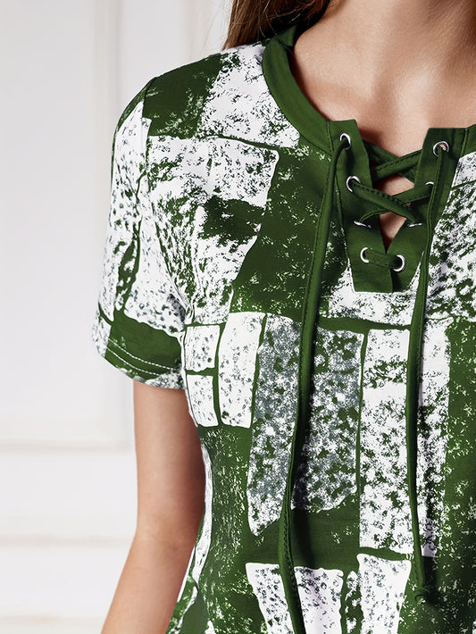 Graphic Print Lace Up V Neck T-shirt, Summer Casual Short Sleeve Top, Women's Clothing