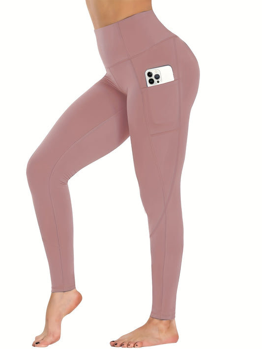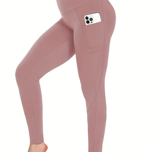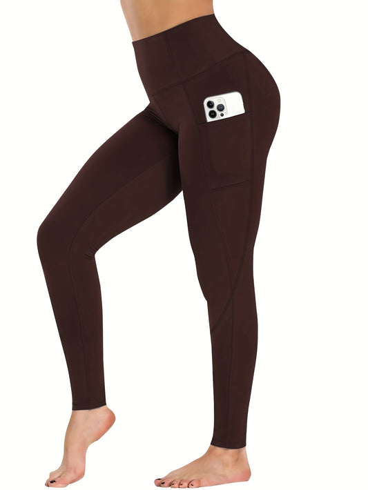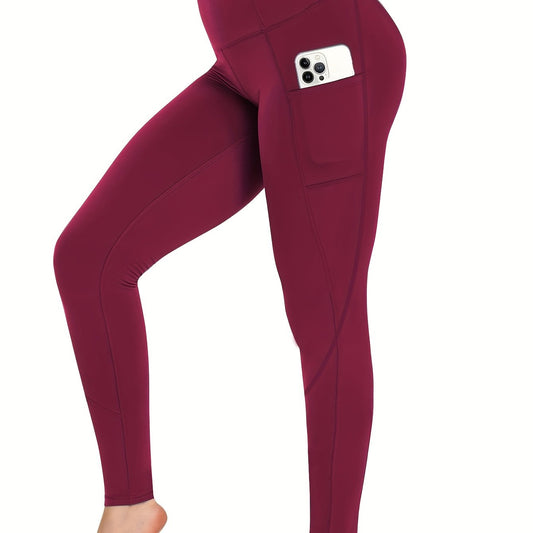 Women's Plus Size High-Waisted Yoga Leggings with Pockets - Stretchy, Comfortable, and Breathable for Running, Dance, and Fitness - Maroon Solid Color, Fitness Wear | Stylish Sports Attire | Pocketed Leggings