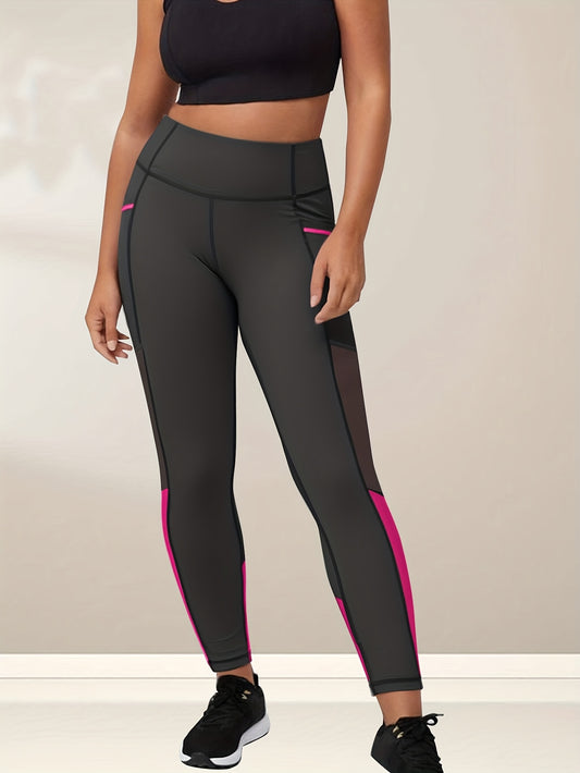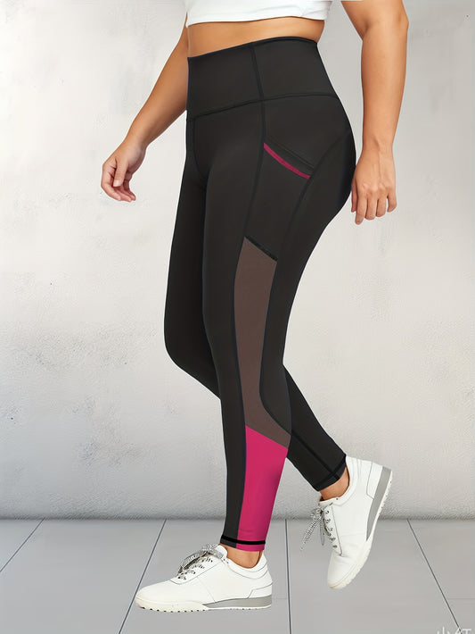 Plus Size Women's High-Waisted Butt-Lifting Yoga Pants Tight-Fit Leggings with Dual Side Pockets, Mesh Panels & Color-Blocking Design Size XL-5XL, 68.58 cm Length for Casual, Sports & Yoga