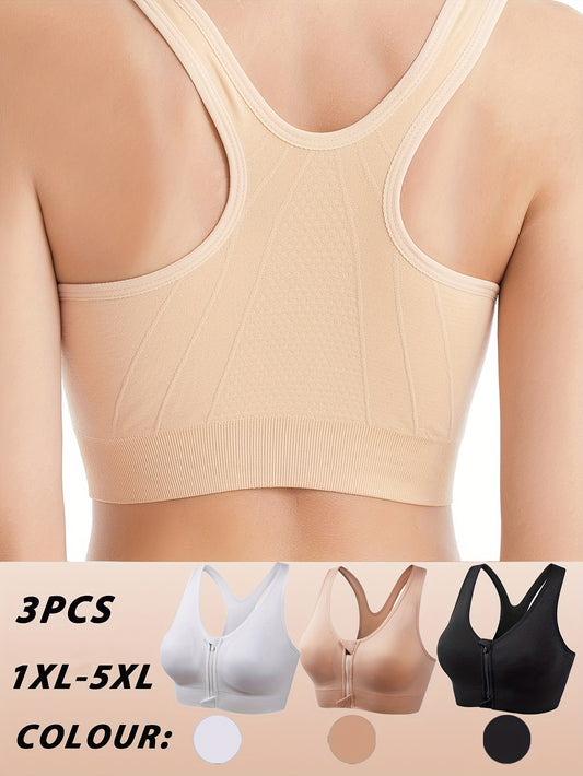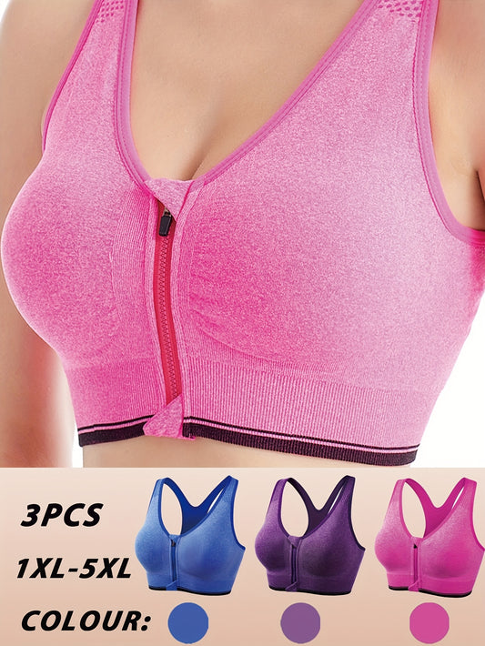 3pcs Plus Size Front Zipper Bras - No Underwire & Removable Pads, Breathable Mesh Running Bras for Women, 1XL-5XL (Navy/Black/Purple), Casual swear, Sleek y Look, Comfortable Fit