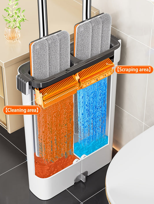JOYBOS Advanced Lazy Mop Kit - Hand-Free Flat Mop with Scraper Bucket, Stainless Steel & Durable ABS Construction, 2 Washable Microfiber Pads for Living Room, Bathroom, Kitchen, Patio, Vinyl Wood & Tile Floors, No Electricity
