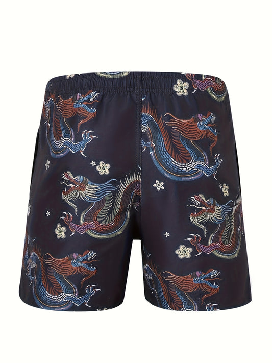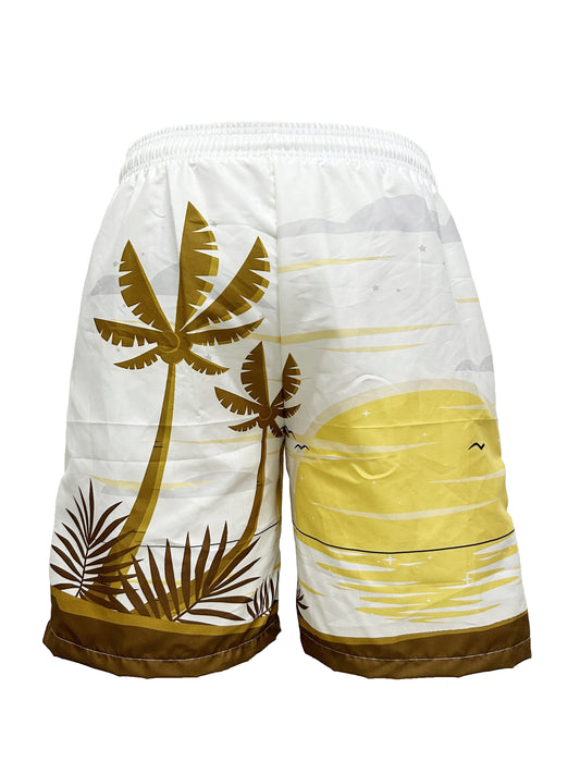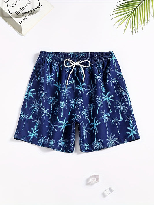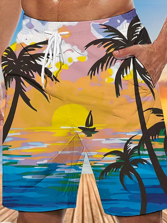 Men's Quick Dry Hawaiian Board Shorts With Pockets, Casual Coconut Tree Graphic Drawstring Swim Trunks For Summer Vacation Beach Pool Outdoor