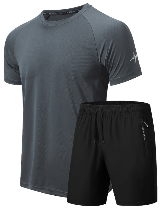 Men's 2Pcs Outfit, Solid Workout Short Sleeve T-shirt & Drawstring Shorts For Basketball Football Exercise Training Running Gym