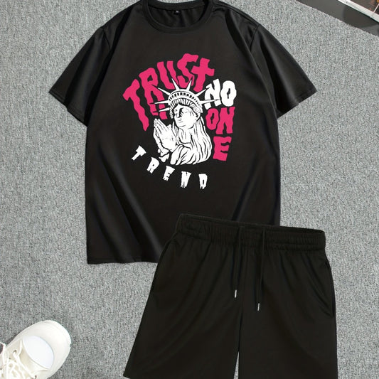 Men's Street Style Summer 2PCS Outfits, Male's Trend TRUST Graphic Short-sleeve Crew Neck T-shirt Drawstring Shorts Set, Casual Clothes For Men