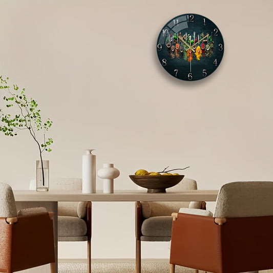 1pc 8-Inch Silent Round Wall Clock with Spice & Herb Design - Acrylic Quartz Movement, Golden Accents, Battery-Powered (AA Not Included) - Kitchen, Bedroom, Living Room, Kitchen Clock, Home Decoration, Decorative Timepiece, H