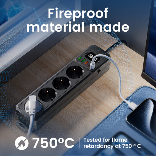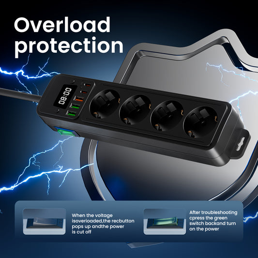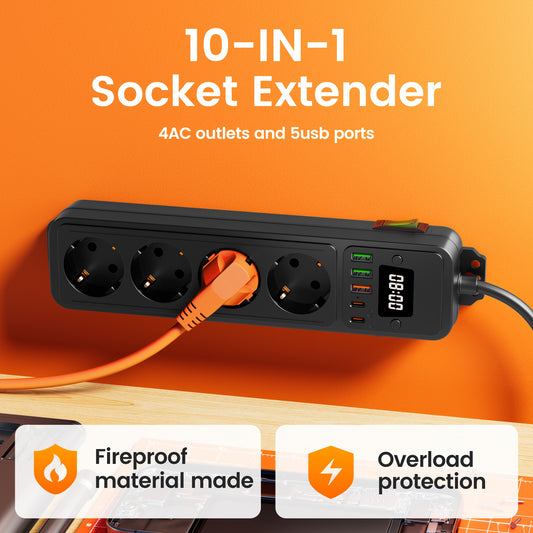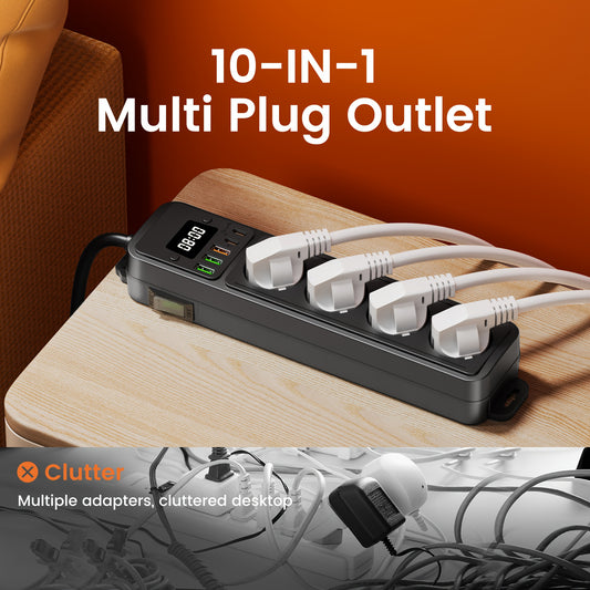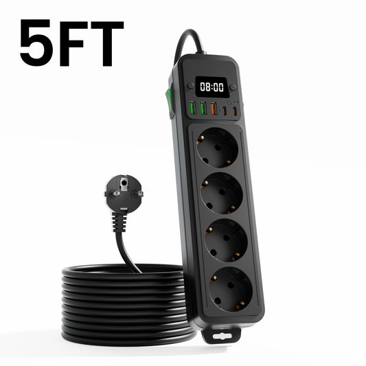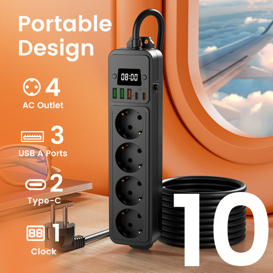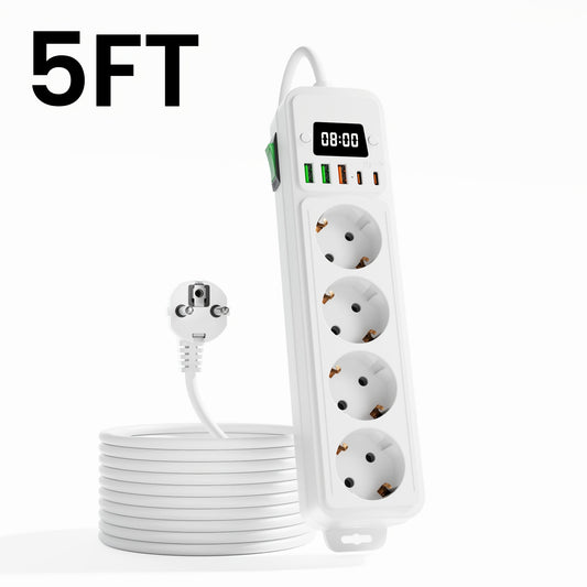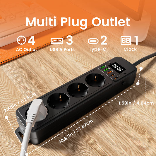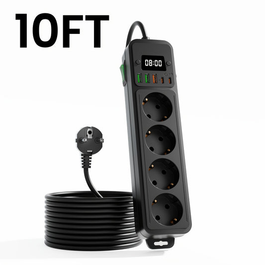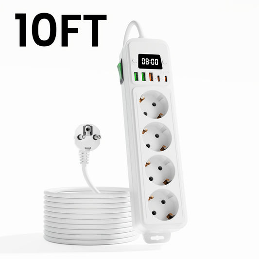 10-in-1 Heavy-Duty EU Power Strip with Global Voltage 220-240V, 4 AC Outlets (Type C/E/F), 2 USB-A & 2 USB-C Ports, Overload & Surge Protection, Built-in Clock, On/Off Switch, Compact Global Voltage Converter for Home/Office/
