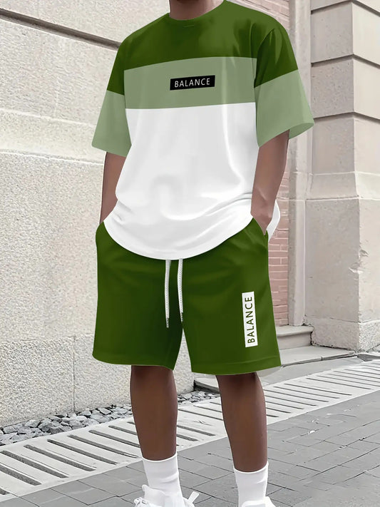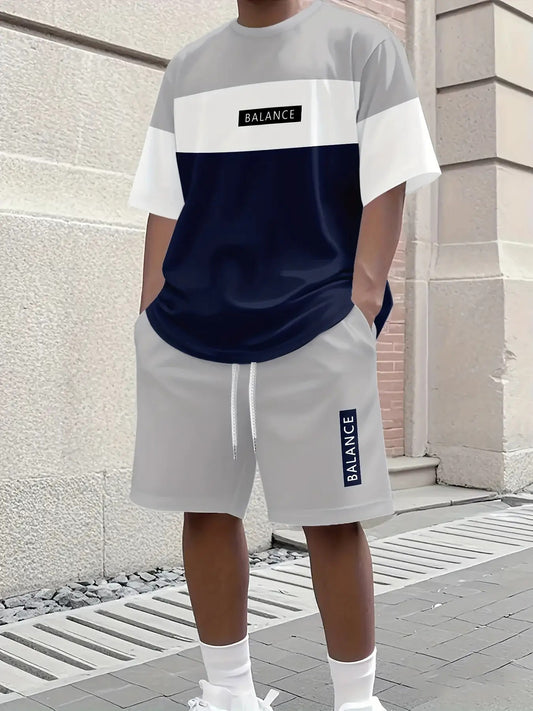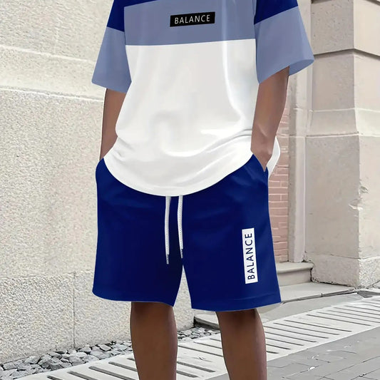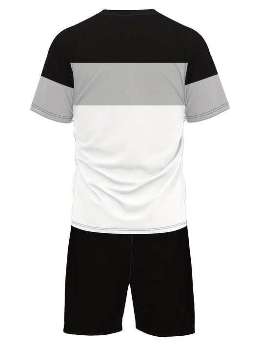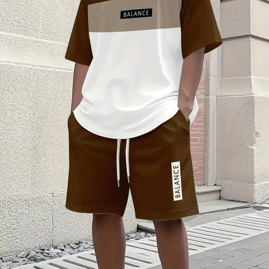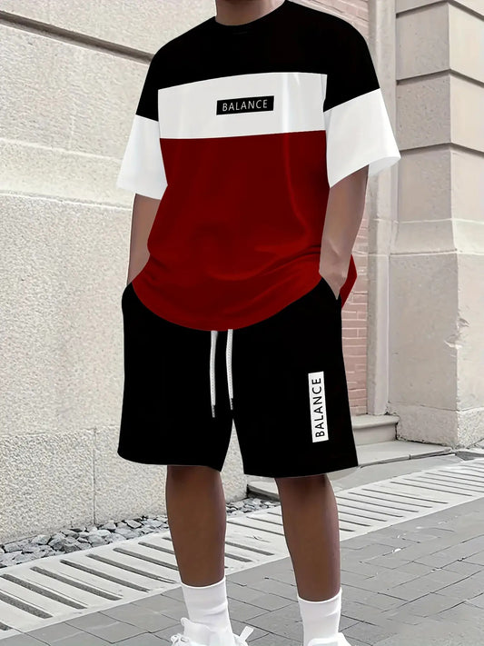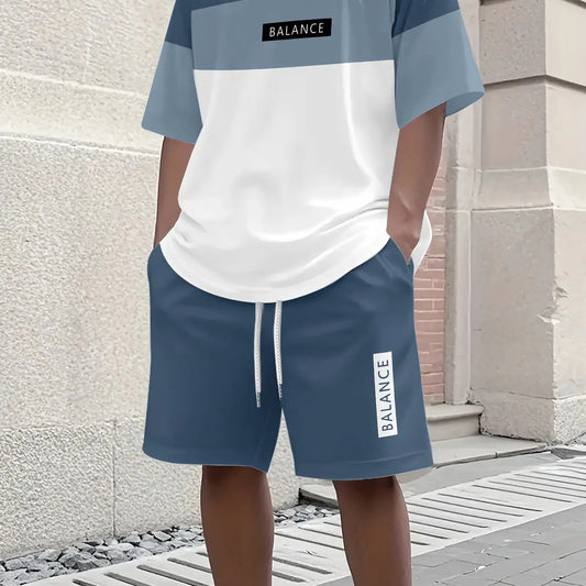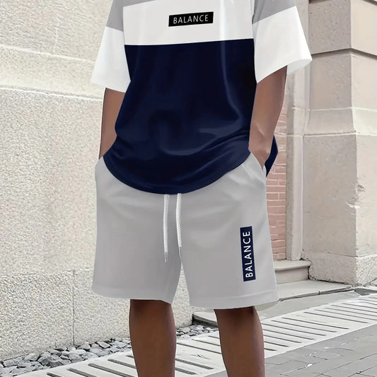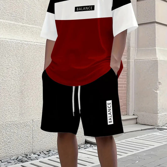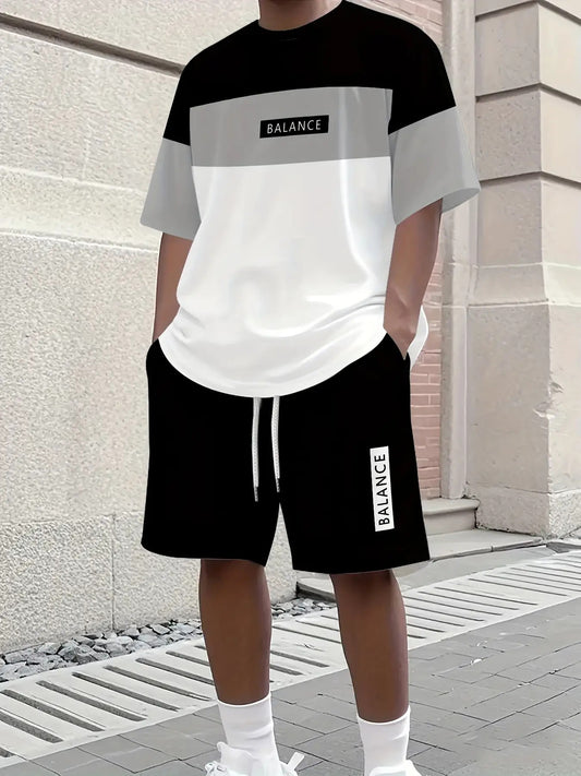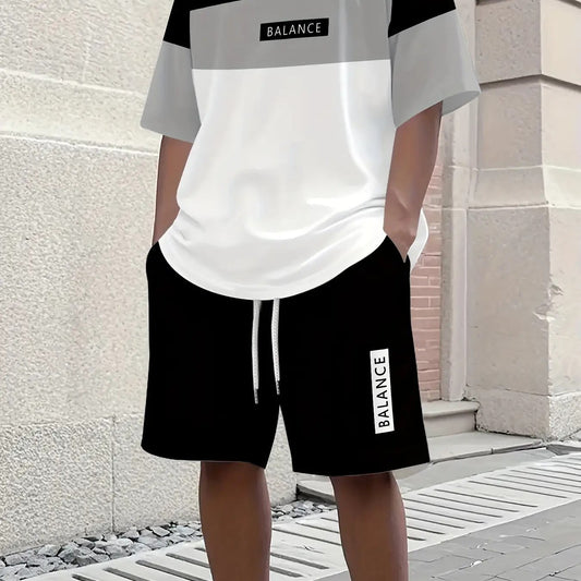 Men'S Plus Size 2pcs Sportswear Set- Black and White Color Block- BALAN Text Design- Lightweight Fitness Clothing Suitable for Running and Casual Summer Wear- Machine Washable Breathable Fabric Shorts and T-Shirt Set, Large S
