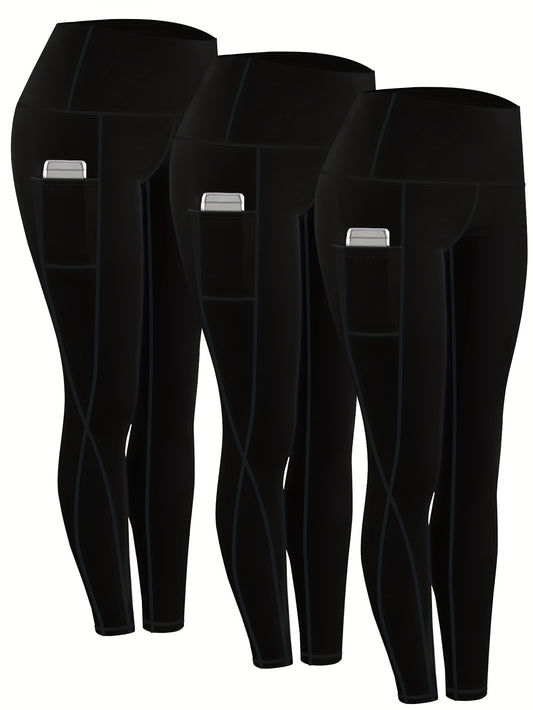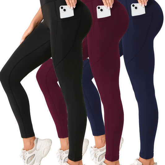3pcs High-Waist Yoga Leggings with Pockets - Tummy Control, Slimming Effect, Stretchy & Breathable Fabric, Black/Brown/Gray, Perfect for Yoga & Casual Attire