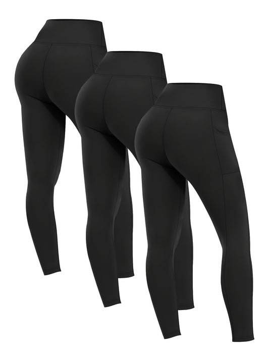3pcs Set Women's High-Waisted Tummy Control Yoga Leggings - Full-Length Opaque Workout Pants with Pockets, 4-Way Stretch Soft Athletic Gym Pants for Running, Fitness, Yoga & Casual Attire - All-Season Tight Bodycon Leggings (