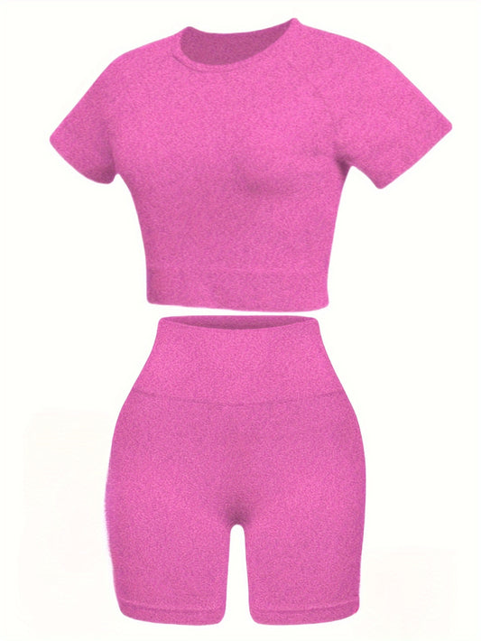 4pcs Seamless High Stretch Women'S Yoga Set - Solid Color Knit Athletic Outfit with Crop Top, Wide Waistband Leggings, Shorts, and Sports Bra for Running, Fitness - All Seasons, Round Neck, Nylon