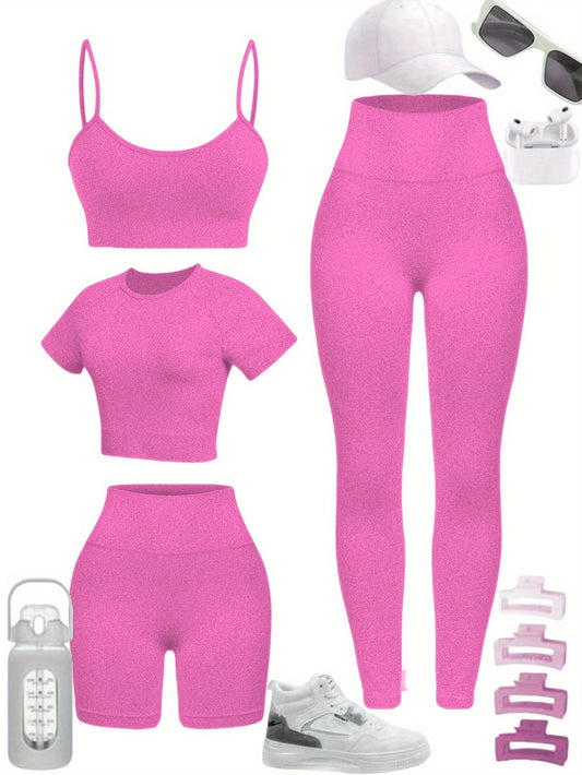 Women's 4-piece Yoga Sportswear Set, Soft Sports High Waist Leggings, Shorts, Sports Bra, Sports Short Sleeves, Gym And Outdoor Sports Fitness Equipment Excluding Accessories