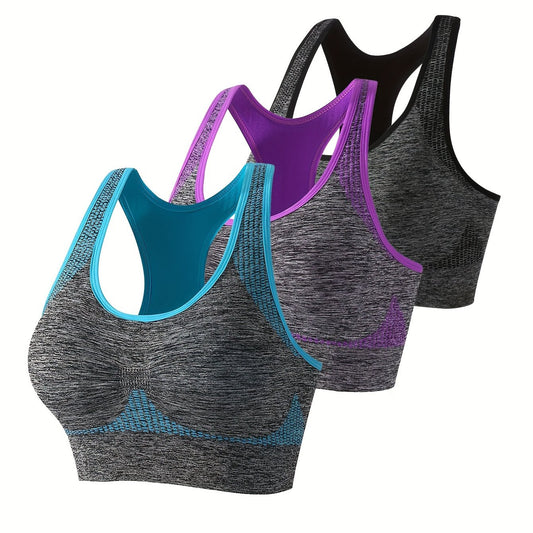 3pcs Contrast Binding Quick Drying Sports Bra, Racerback Shockproof Running Fitness Crop Tank Top, Women's Activewear