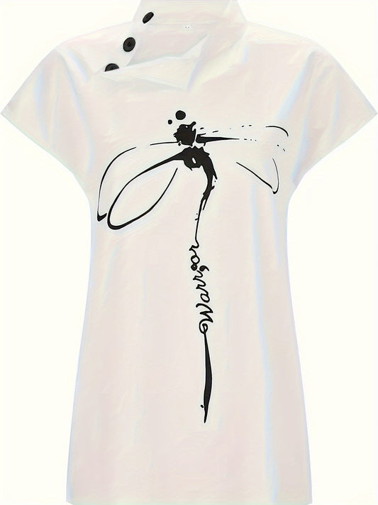 Dragonfly Print Skew Button Blouse, Elegant Short Sleeve Top For Spring & Summer, Women's Clothing