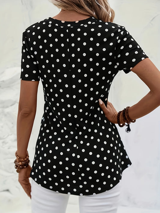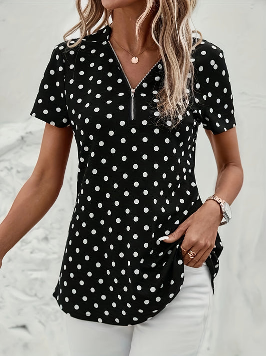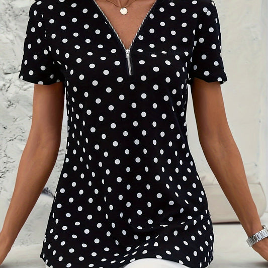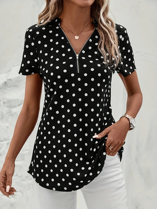 Polka Dots Print V Neck Blouse, Elegant Zipper Front Short Sleeve Blouse For Spring & Summer, Women's Clothing