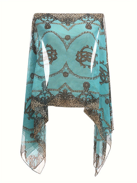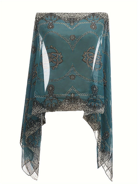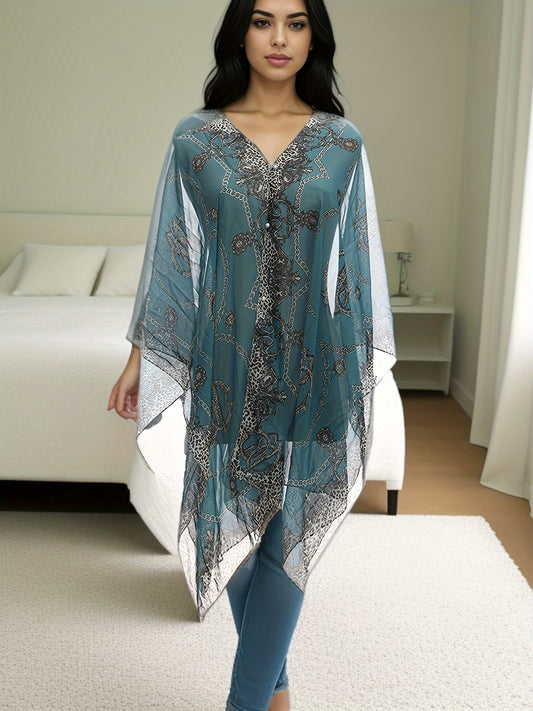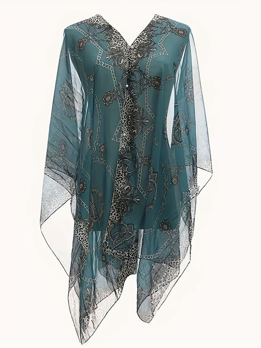 Plus Size Chain Print V Neck Shawl Top, Elegant Long Sleeve Blouse For Spring & Summer, Women's Plus Size Clothing