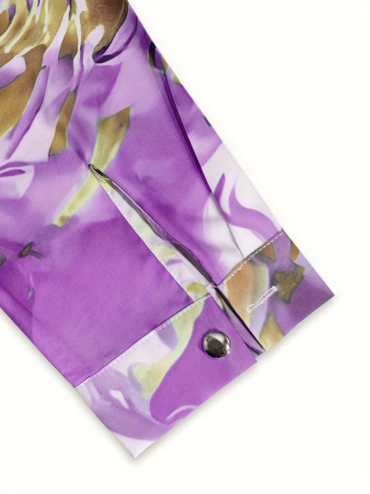 Floral Print Button Front Blouse, Elegant Long Sleeve Blouse For Spring & Fall, Women's Clothing