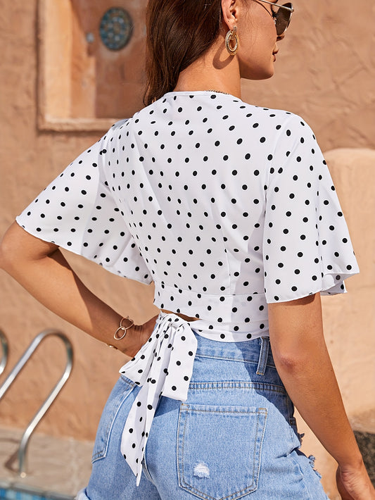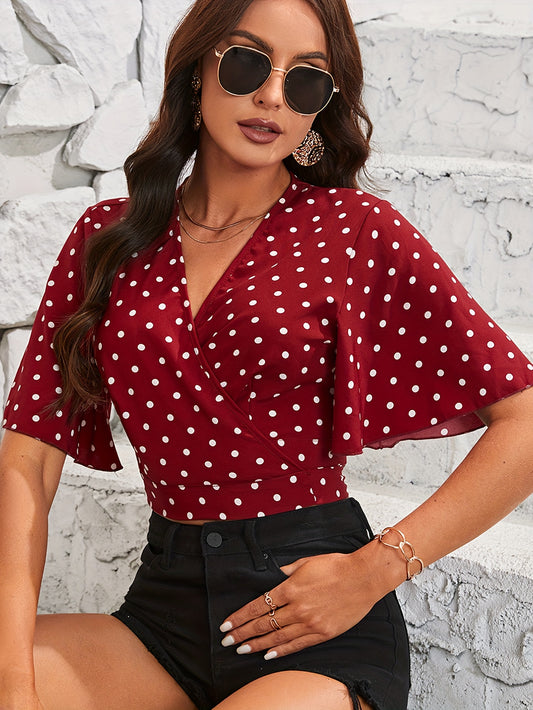 Polka Dot Print Surplice Neck Blouse, Elegant Ruffle Sleeve Crop Top For Spring & Summer, Women's Clothing
