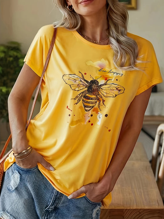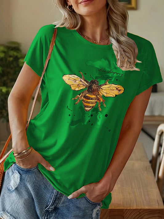 Bee Print Crew Neck T-Shirt, Casual Short Sleeve Top For Spring & Summer, Women's Clothing